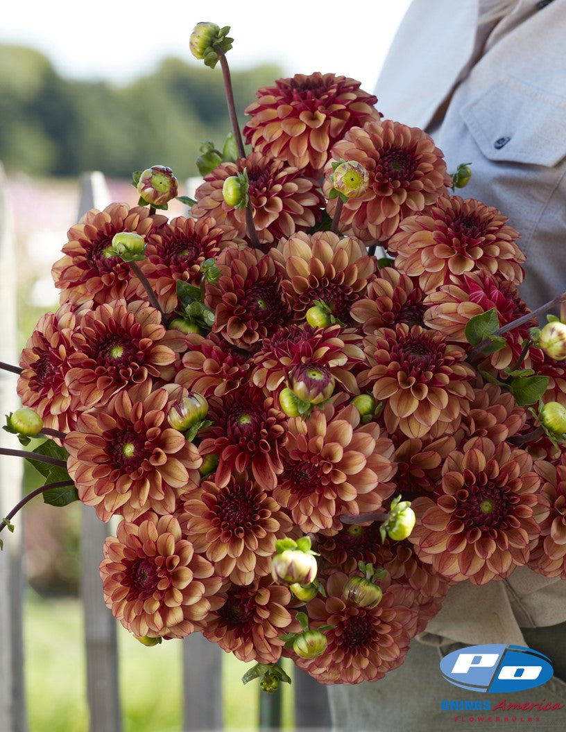 A stunning ball-shaped dahlia in a rather unique, brown color.